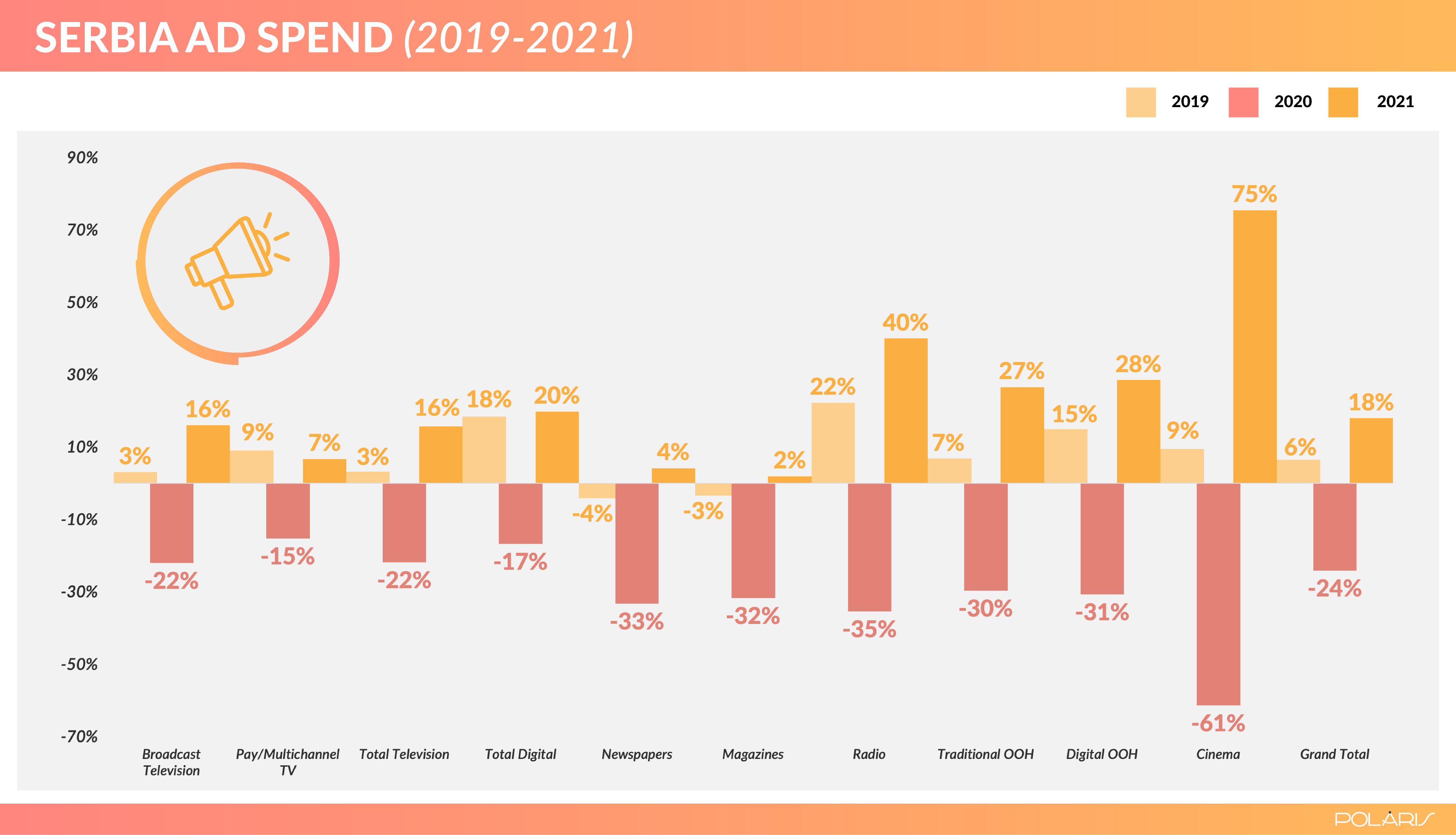 Predviđanja za 2021 su optimističnija – prema procenama IMF-a globalna ekonomija će se oporaviti (GDP +5.8%), a veliki sportski događaji će imati značajan uticaj na oporavak advertajzing industrije i ulaganja u oglašavanje. Podaci govore da će globalno advertajzing tržište beležiti rast od +6.1%, ali i pored oporavka u 2021 ulaganja će biti manja za $9 milijardi u odnosu na period pre COVID-19 krize. U regionu, za Srbiju se predviđa oporavak od skoro +18% u odnosu na 2020, ali s obzirom na veliki pad u 2020, ulaganja će i dalje biti manja nego u 2019 (187 miliona u 2021 vs. 209 miliona u 2019). Hrvatska i Bugarska takođe očekuju rast za +13% i +6%, što obe zemlje dovodi na nivo investicija iz 2019 godine.